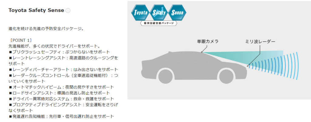 最新の予防安全パッケージ「Toyota Safety Sense」も、もちろん全車標準装備です。