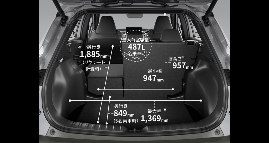トヨタ カローラクロスの荷室容量は、通常時で487L(ハイブリッド2WD)と、ファミリーユースに十分な容量を確保しています。週末のお出かけやレジャー、日常の買い物など、様々なシーンで活躍します。