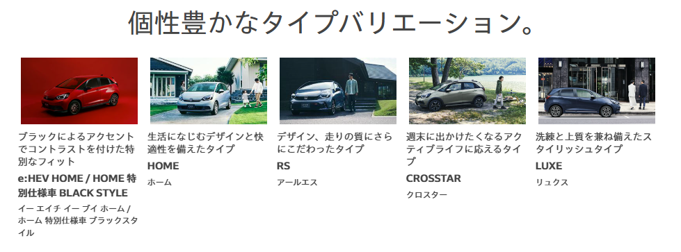 ホンダ フィットは、5つのタイプ(BASIC、HOME、NESS、CROSSTAR、LUXE)と、2つのパワートレイン(ガソリン、e:HEV)、2つの駆動方式(FF、4WD)の組み合わせにより、幅広い選択肢が用意されています。