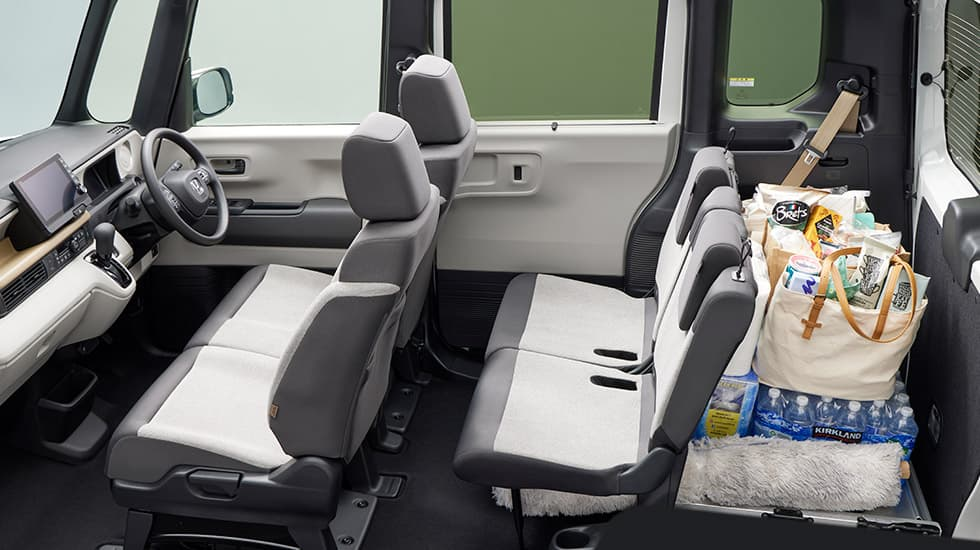 後席はワンアクションでダイブダウン(足元に収納)でき、自転車を積むことも可能です。また、座面を跳ね上げれば、背の高い観葉植物やベビーカーを畳まずに積めるなど、ホンダ車ならではの「チップアップ機構」も健在です。